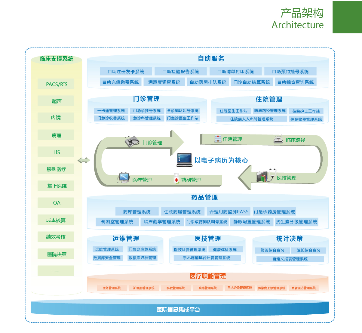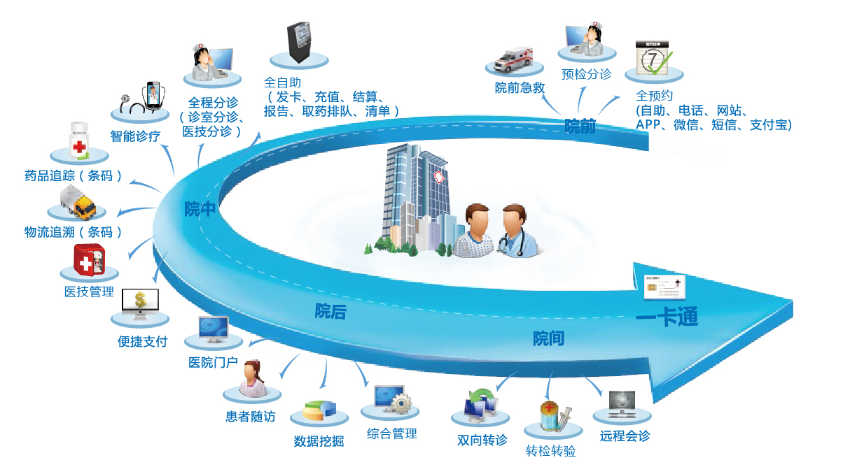 8大特色應用: 全自助、全預約、全程分診、智能診療、藥品追蹤、物流追溯、便捷支付、流程定制